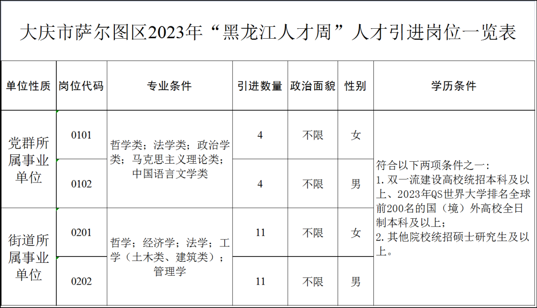 計(jì)劃引進(jìn)黨群所屬事業(yè)單位工作人員8人,街道所屬事業(yè)單位工作人員22人,具體引進(jìn)崗位、數(shù)量要求詳見《薩爾圖區(qū)2023年“黑龍江人才周”人才引進(jìn)崗位一覽表》(見附件)。