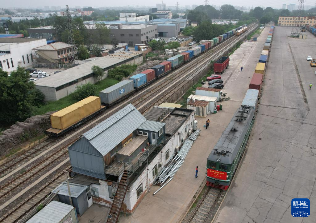 6月30日,北京至阿塞拜疆巴庫的跨里海中歐班列停靠在位于北京市房山區(qū)的北京國(guó)際陸港等待發(fā)車(無人機(jī)照片)。