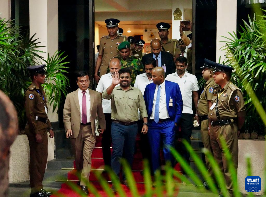 ? 9月22日,在斯里蘭卡首都科倫坡,迪薩納亞克(中)確認(rèn)勝選后走出選舉委員會。