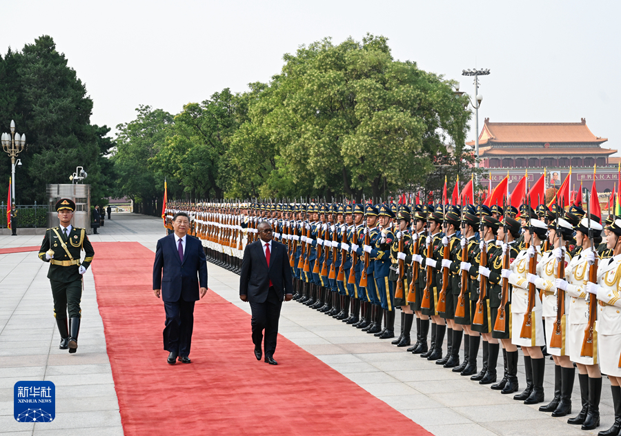 ??恩巴洛抵達時,禮兵列隊致敬。兩國元首登上檢閱臺,軍樂團奏中國和幾內亞比紹兩國國歌,天安門廣場鳴放21響禮炮。恩巴洛在習近平陪同下檢閱中國人民解放軍儀仗隊,并觀看分列式。