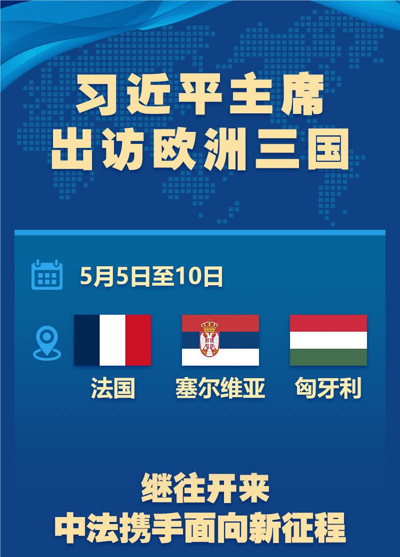 ??應(yīng)法蘭西共和國總統(tǒng)馬克龍、塞爾維亞共和國總統(tǒng)武契奇、匈牙利總統(tǒng)舒尤克和總理歐爾班邀請,國家主席習(xí)近平將于5月5日至10日對上述三國進行國事訪問。